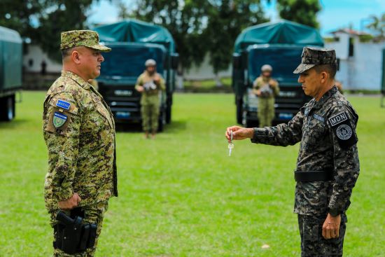 El Ministro de la Defensa Nacional, Vicealmirante, René Francis Merino Monroy, realizó la entrega de 16 camiones para el transporte de carga y al personal que ejecuta tareas en cumplimiento del Plan Control Territorial.
