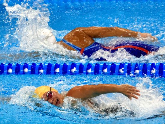 los nadadores salvadoreños también entraron en acción en el Centro Acuático Olímpico. La primera en saltar al agua fue Elena Amos, que participó en el heat 3 de las eliminatorias de los 100 metros libre y registró un tiempo de 1:00.86 minutos, sin embargo su marca no fue suficiente para avanzar a la final de la prueba.
