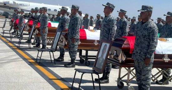 Por su parte, en la Base Aérea Militar número cinco, se realizó una ceremonia encabezada por la Secretaría de la Defensa Nacional (Sedena) en homenaje a los elementos abatidos en cumplimiento de su deber. Durante el acto solemne, los féretros fueron cubiertos con la Bandera Nacional y se montaron guardias de honor por parte del personal militar.